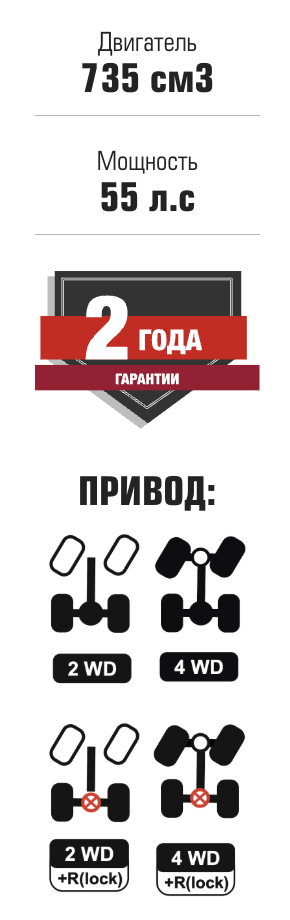Двигатель 4-тактный, одноцилиндровый, SOHC c системой электронного впрыска EFI. Привод: 2WD/4WD/R-lock. Передняя независимая подвеска на двух А-образных рычагах, задняя независимая подвеска на продольных рычагах. Легкосплавные диски, резина 27″.